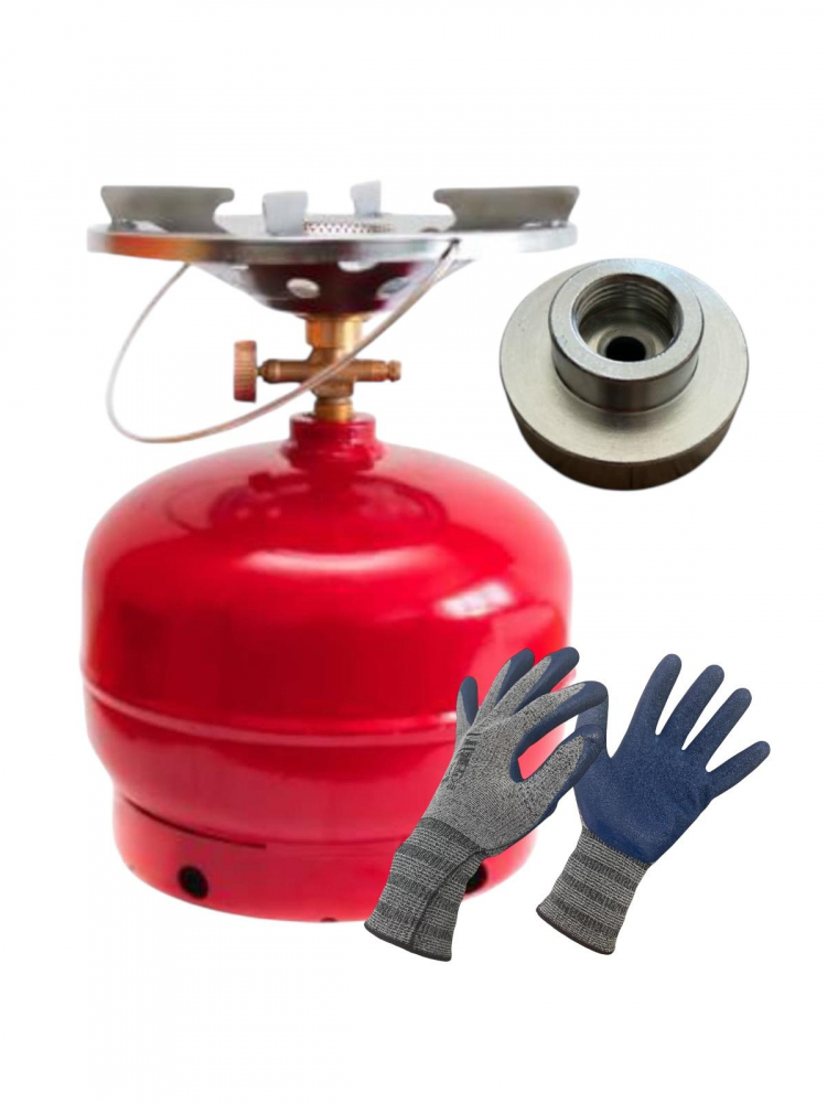 Butelia este reîncărcabilă și compatibilă cu arzătoarele standard pe GPL, iar arzătorul inclus permite aprinderea și folosirea imediată. Mănușile oferă protecție termică și siguranță în manipularea echipamentului fierbinte.