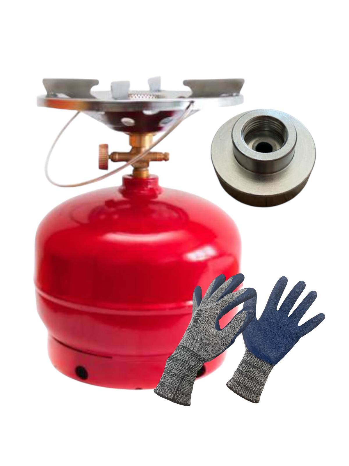 • Pachet complet pentru voiaj: butelie 3L + arzător + racord Ø22 mm + mănuși