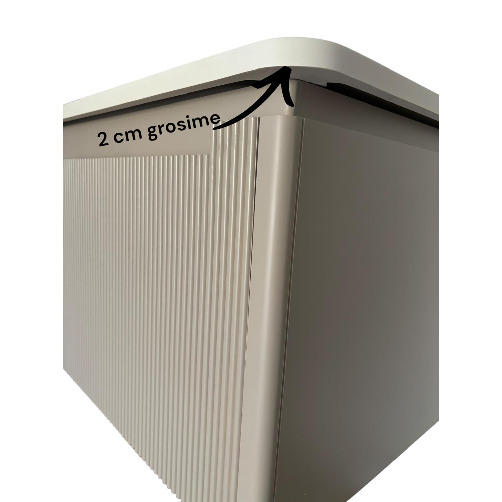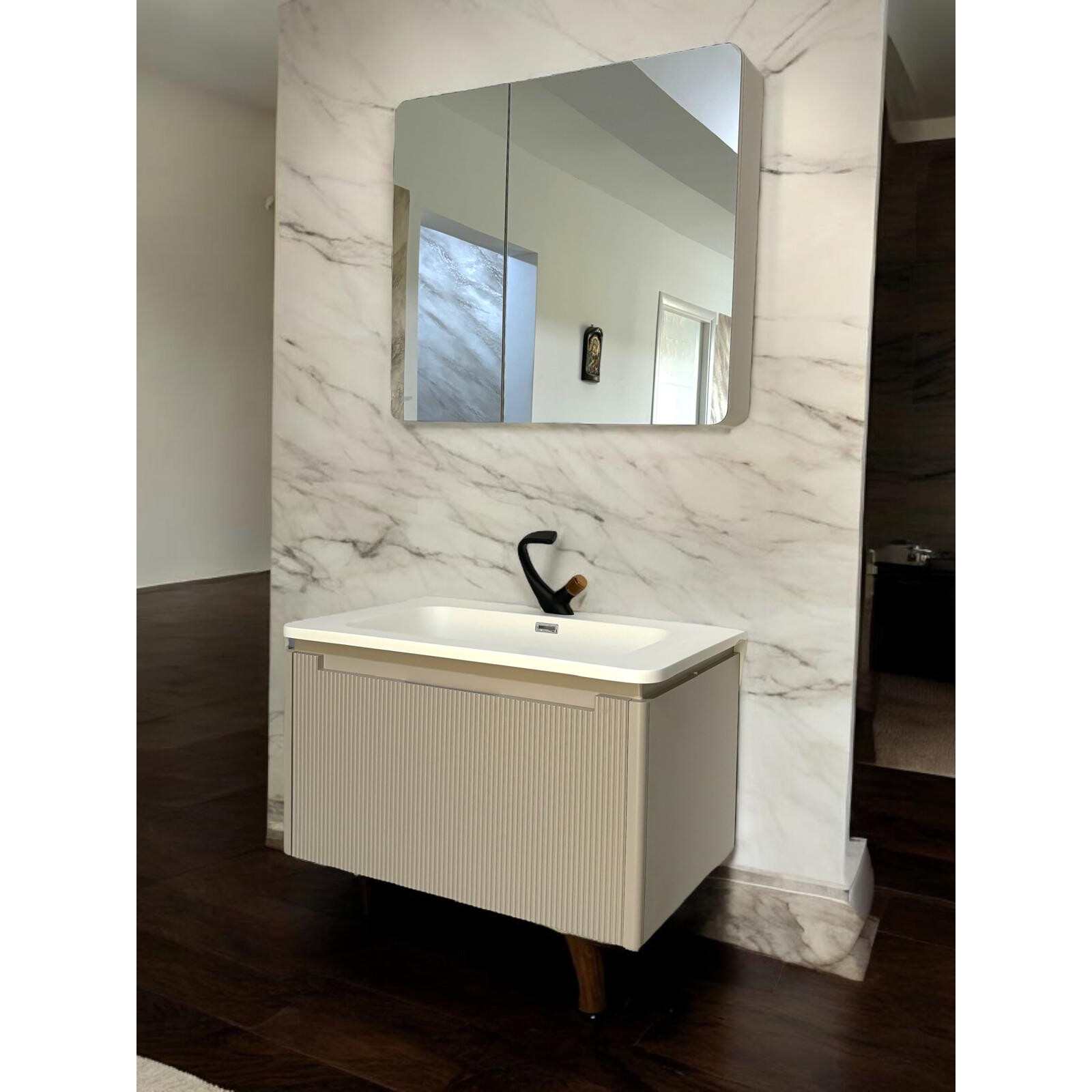 Blatul de 2 cm grosime este completat de lavoarul inclus, iar dulapul suspendat cu oglindă cu două uși (80 x 70 x 14 cm) oferă spațiu de depozitare practic și design coerent. Toate componentele sunt gândite pentru funcționalitate și estetică într-un stil modern, ușor de întreținut.