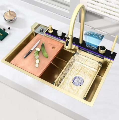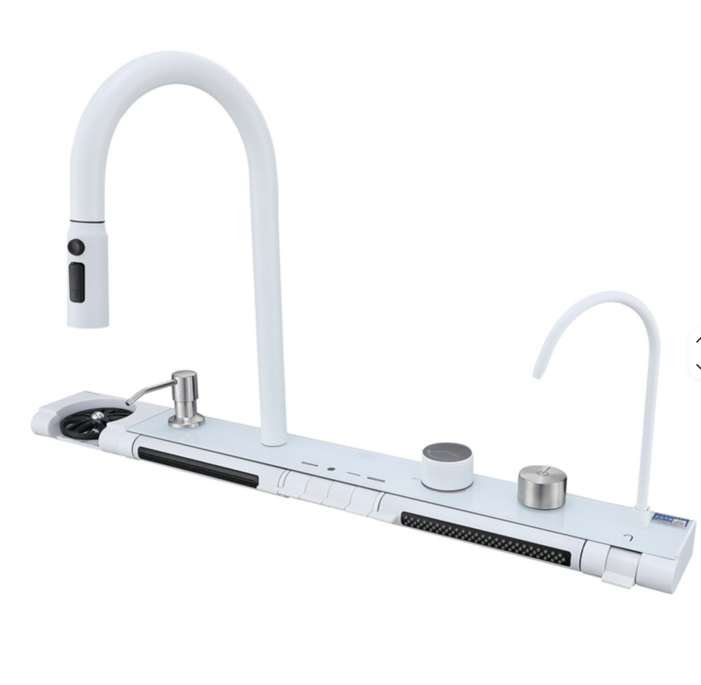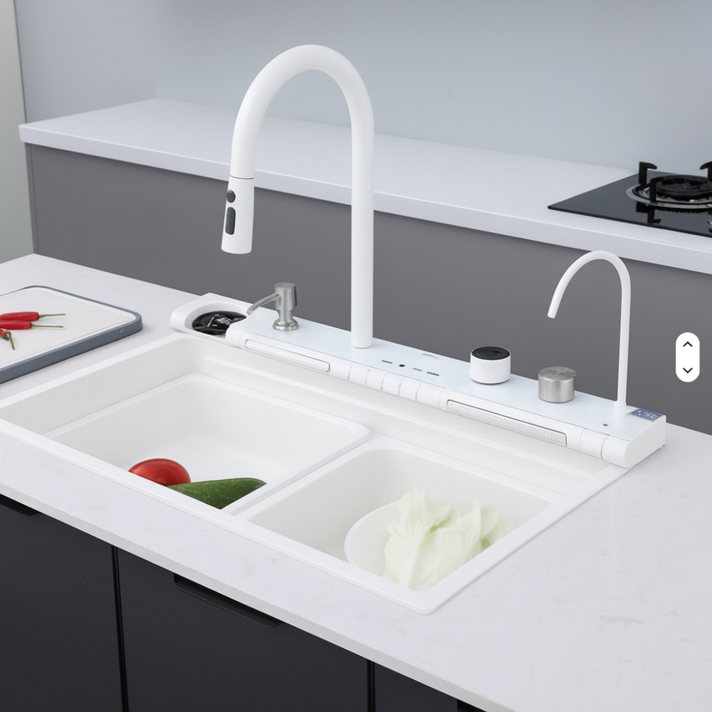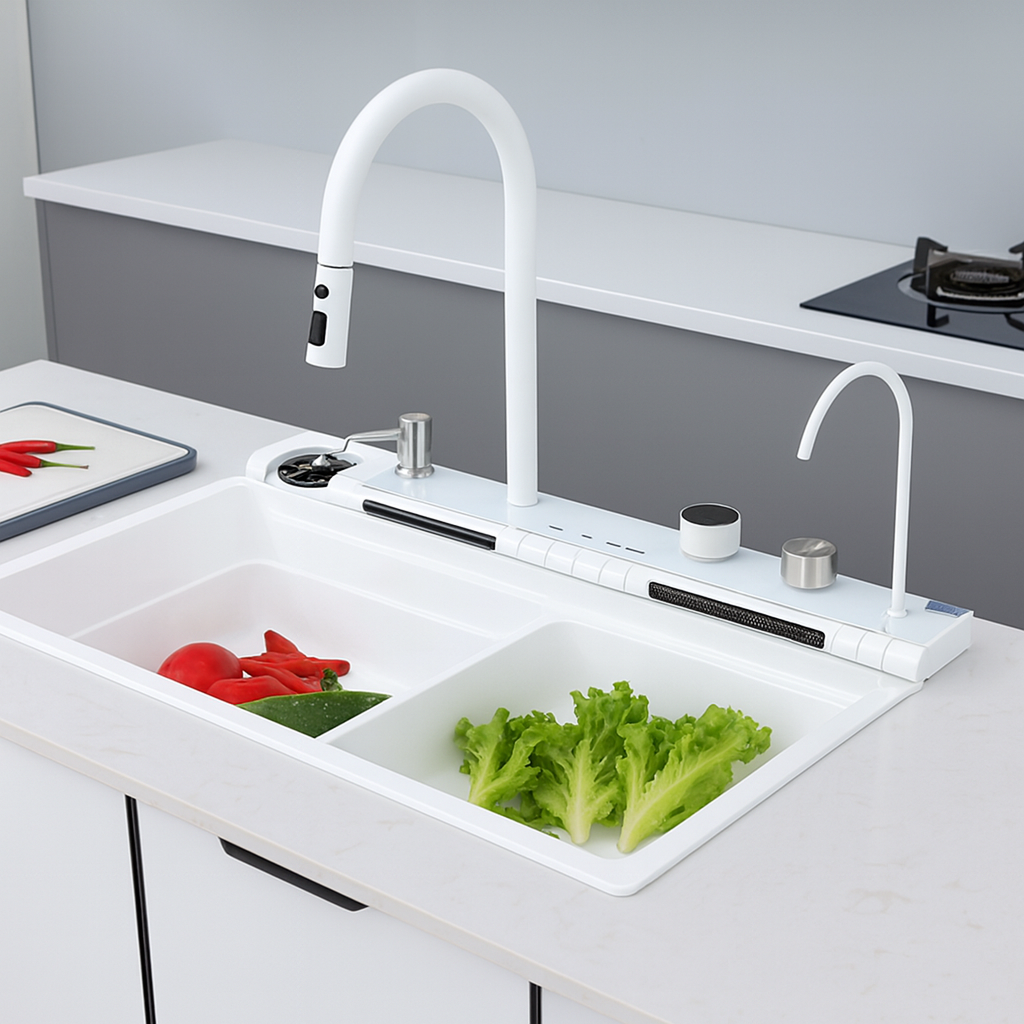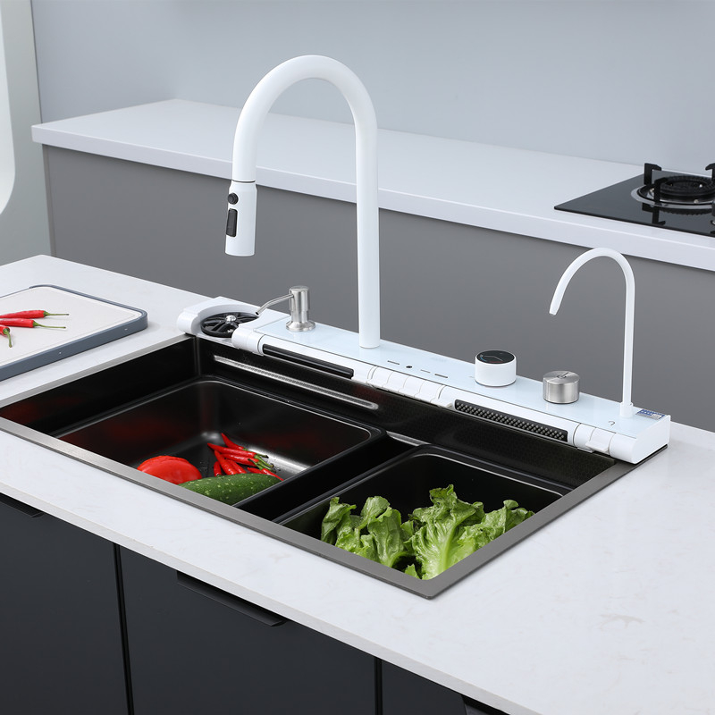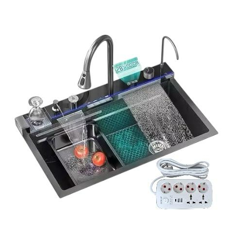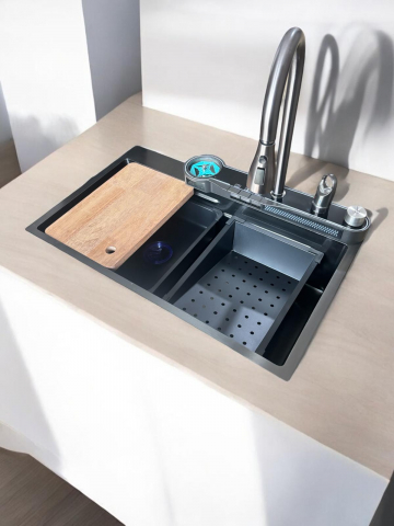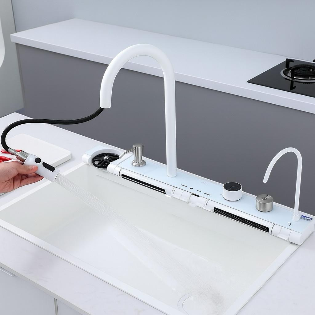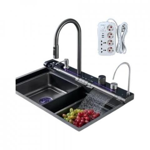 Chiuvetă multifuncțională albă, cu 2 cascade reglabile pe înălțime, iluminare LED și afișaj pentru temperatura apei și timpul de curgere, alimentate autonom prin mini hidro-generator. Include 2 tăvițe, tocător, set scurgere și spălător de pahare negru acționabil prin apăsarea paharului. Baterie pentru apă filtrată inclusă (fără filtru).