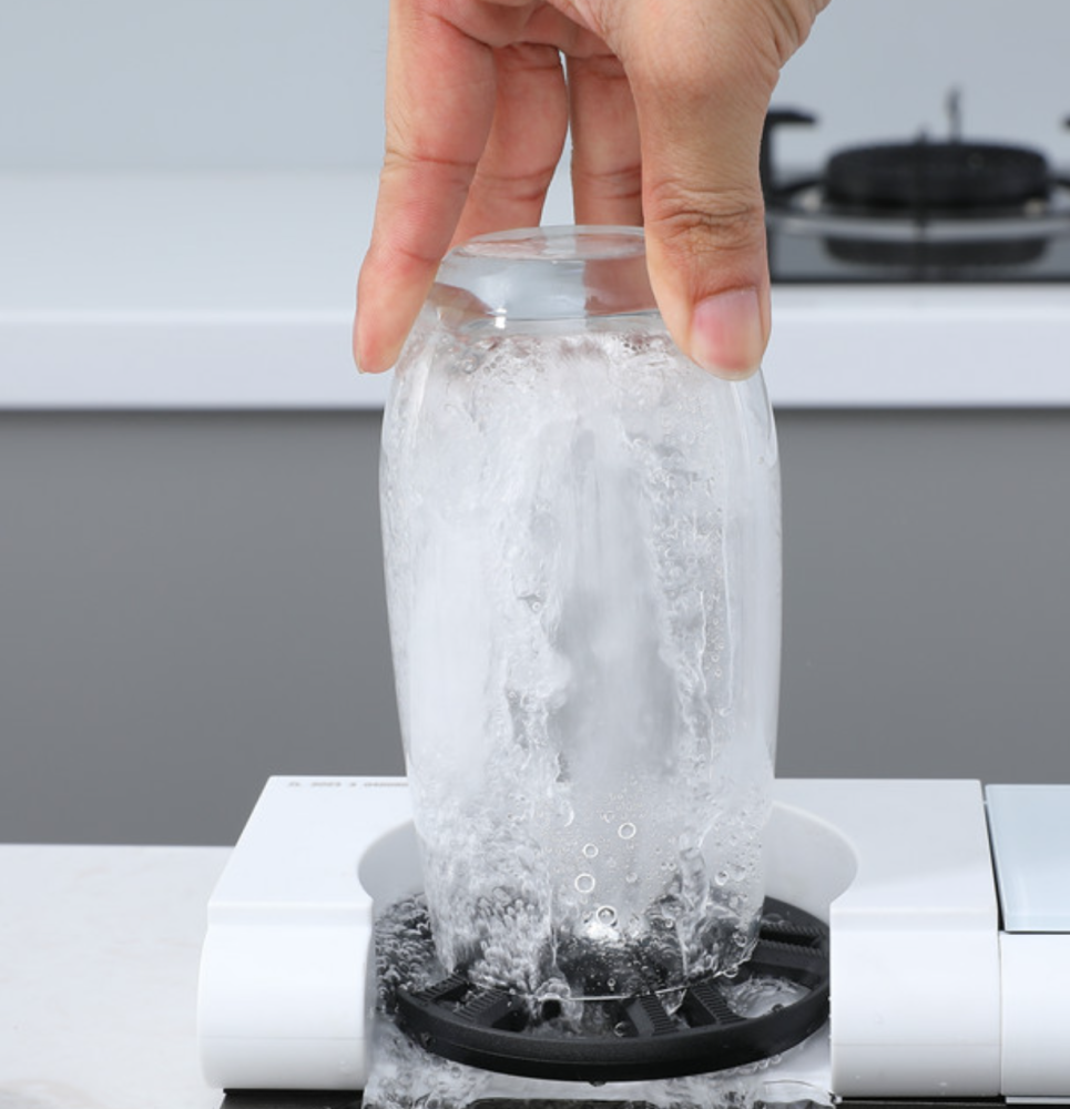 Spălătorul de pahare este negru și se acționează prin apăsarea paharului (nu doar din buton, ca la modelele entry).