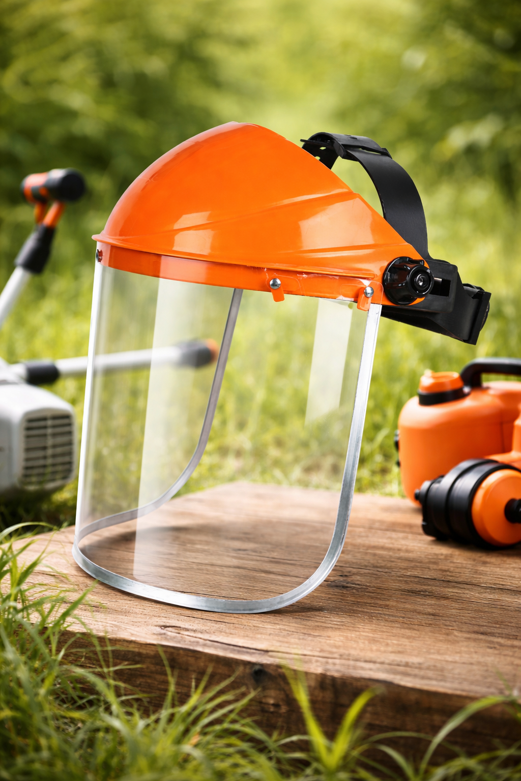 Cască – mască de protecție AVI® pentru motocoasă, echipată cu vizieră din plastic transparent și sistem de fixare reglabil. Oferă protecție și vizibilitate clară în timpul lucrului.