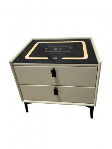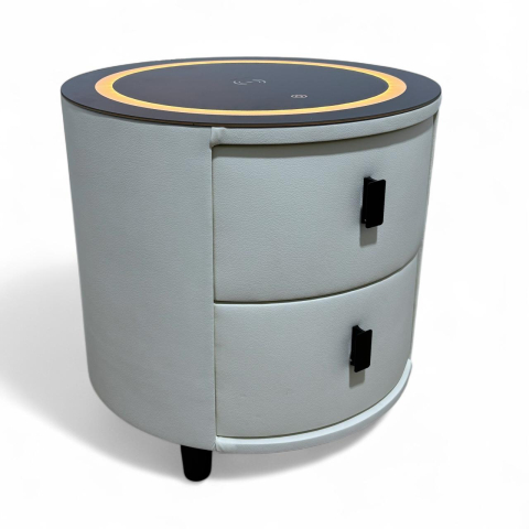 Această noptieră smart rotundă îmbină funcționalitatea modernă cu un design sofisticat, fiind alegerea perfectă pentru dormitoarele contemporane. Modelul este tapițat cu piele ecologică premium și dispune de două sertare spațioase pentru organizarea obiectelor personale.