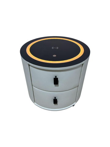 Noptieră smart rotundă cu două sertare, blat sticlă securizată cu încărcare wireless și iluminare ambientală, diametru 45.5 x înălțime 46.5 cm, AVI-5226A