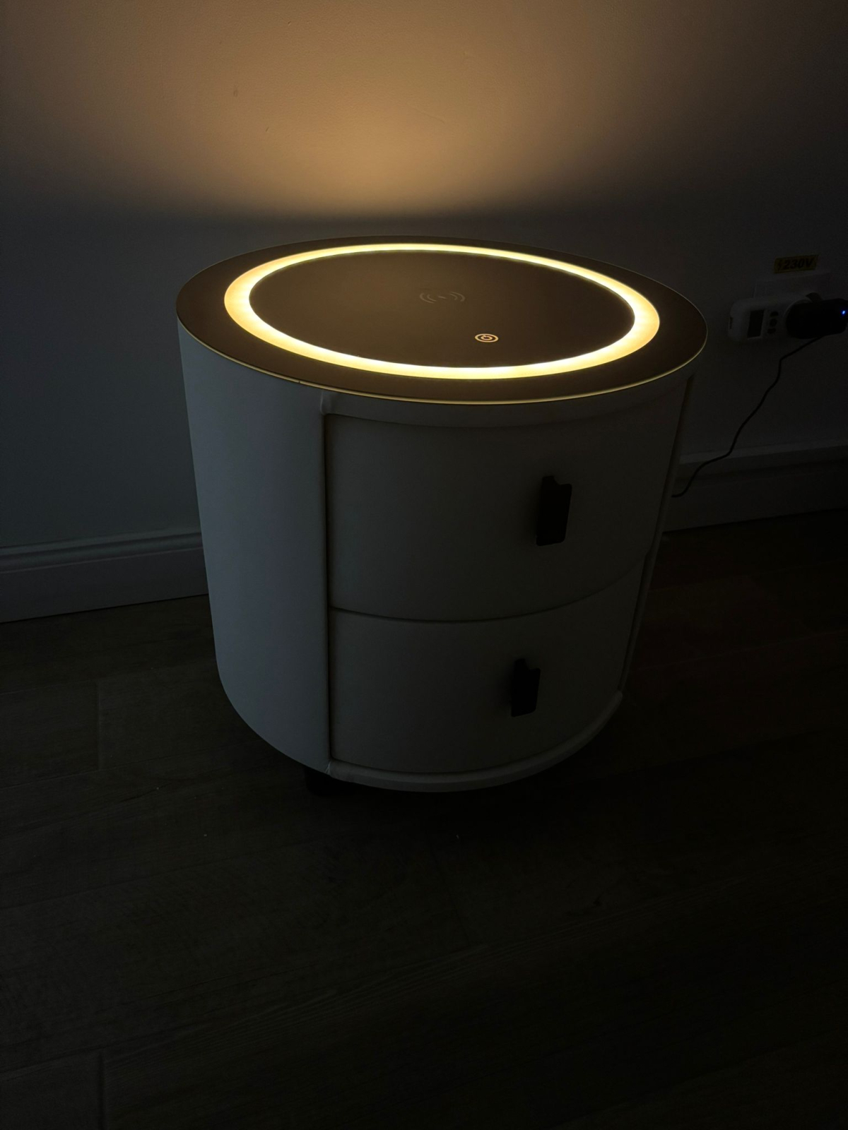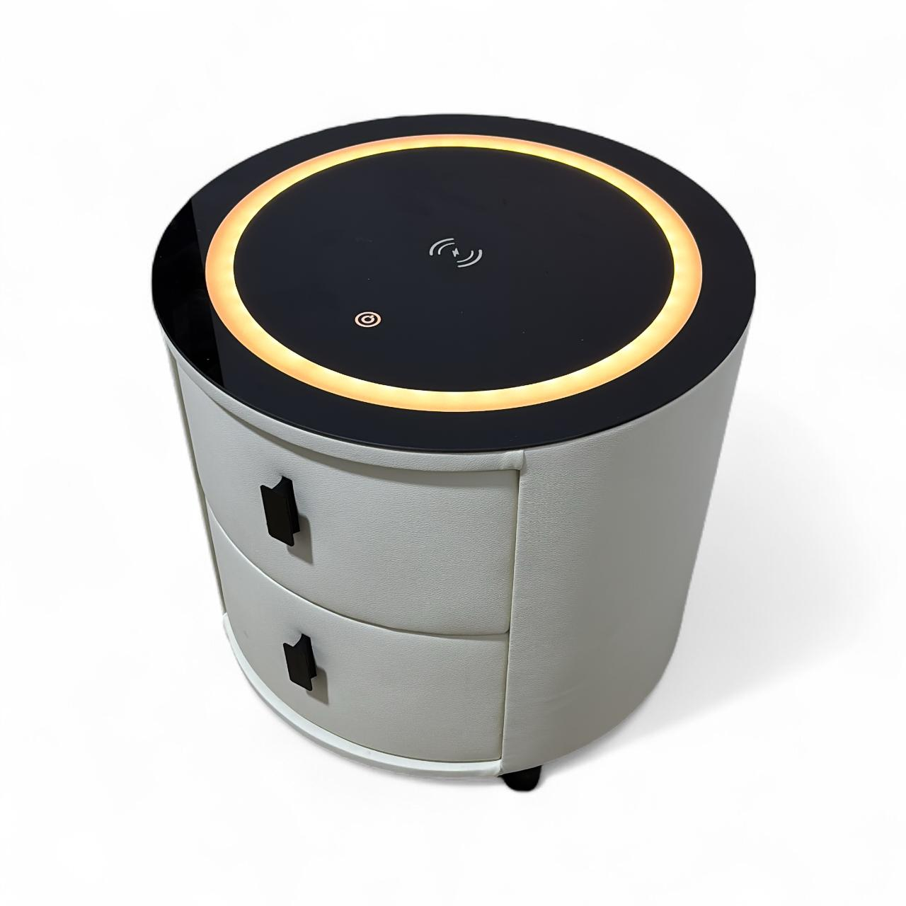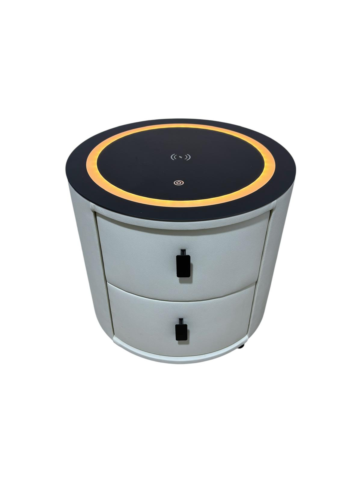 Noptieră smart rotundă, tapițată cu piele ecologică, două sertare, blat din sticlă securizată cu încărcare wireless pentru telefon și iluminare ambientală cu lumină rece, caldă și neutră. Livrată complet asamblată.